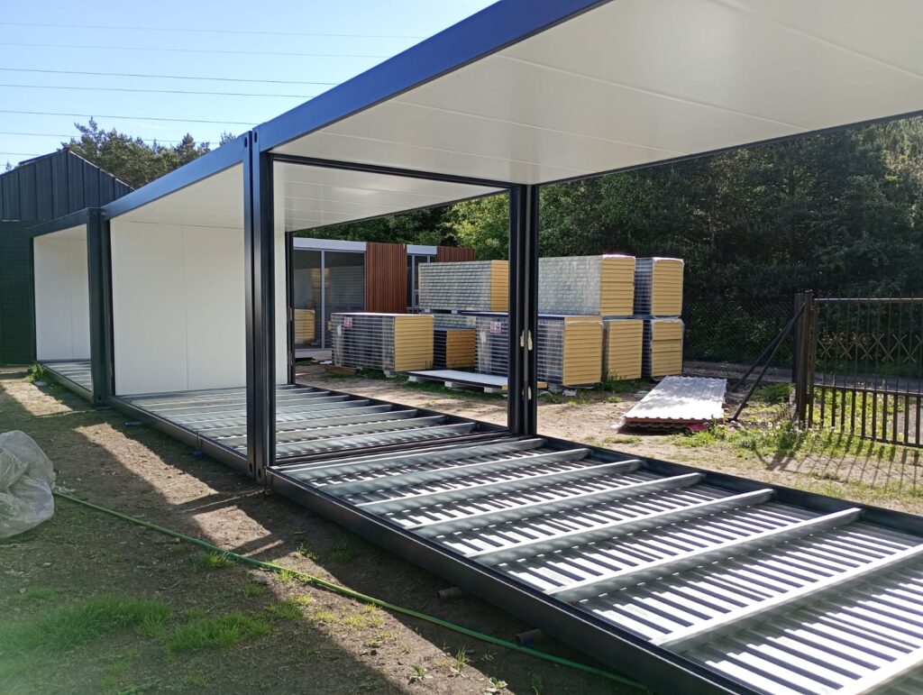 Widoczne moduły zostały wykonane z wytrzymałych profili stalowych oraz odpornych na warunki atmosferyczne paneli ściennych. Taka konstrukcja zapewnia bezpieczeństwo użytkowania i pozwala na projektowanie obiektów dopasowanych do indywidualnych potrzeb. Kontenery modułowe można łączyć w większe układy, przenosić, rozbudowywać, a także dostosowywać pod konkretne przeznaczenie — od zaplecza socjalnego po atrakcyjne punkty handlowe.
